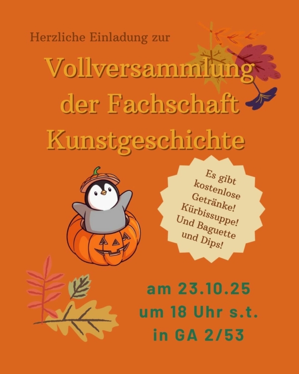 wir laden euch herzlich zur Vollversammlung der Fachschaft Kunstgeschichte am 23.10.2025, um 18:00 Uhr s.t. im FSR-Raum (GA 2/53) ein. Gemeinsam lassen wir das letzte Semester Revue passieren, wählen den neuen Fachschaftsrat und Zuständigkeiten für AG’s. Als FSR vertreten wir eure Interessen, sind in hochschulpolitischen Gremien aktiv und veranstalten coole Events für euch (und wir haben einen eigenen Raum!!!). Kommt gerne vorbei, wenn ihr Lust habt euch zu vernetzen oder Interesse an der Fachschaftsarbeit habt. Auch wenn ihr euch nicht in den FSR wählen lassen wollt, seid ihr herzlich willkommen. Außerdem gibt es kostenlose Suppe, Baguette und Dips, Snacks und Getränke. Wir freuen uns auf euch!